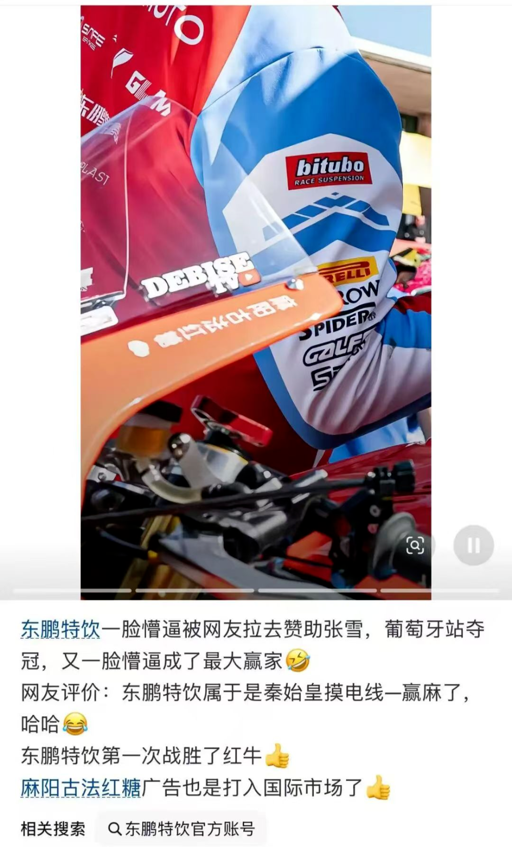不但车手和机车不被外界看好,就连车身上的广告,都显得格外寒酸、上不了台面。当初张雪机车拉合作时,没有顶级赞助加持,只有网友怂恿下才赞助的“东鹏特饮”;还有来自湘西深山的“麻阳古法红糖”——那是春节前张雪回老家做客时,因看到村里红糖销路不佳,郑重许下的承诺:“带你们的红糖去比赛。”