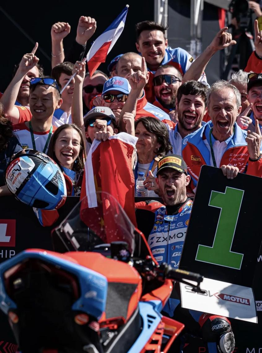 冲线后,德比斯,这位曾被雅马哈退货的车手,坐在红色的张雪机车上,对着天空挥拳,又不停地摇头,远在重庆观看直播的张雪也泪流满面。