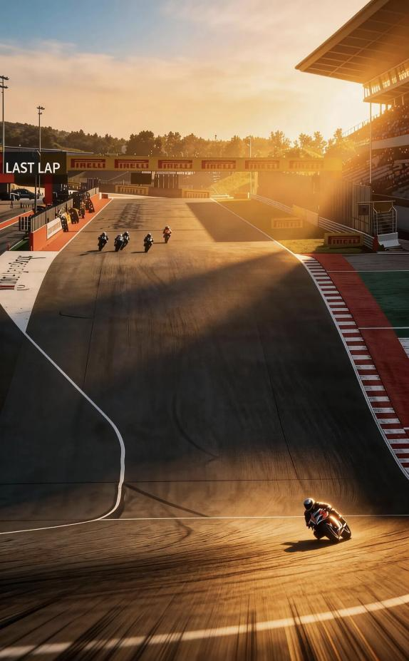 一台编号53、涂装红白蓝三色的机车率先冲过终点线。在它身后,拉出巨大的真空地带,四辆国际知名品牌机车,只能激烈地争夺第二名。